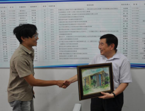 院学生会主席刘星伯同学代表外语院全体学生为高书记送上外语楼整体的水彩画一幅作为教师节礼物,礼轻情意重,一幅画饱含了同学们对学校的感激之情以及对高书记的节日祝福。