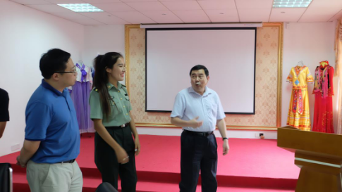 在民族团结教育活动室,来自新疆哈萨克族的外语院16级新生辅导员艾博塔带领大家参观并介绍了民族团结教育基地建设情况以及少数民族学生获得的系列成绩。在参观学院创新创业工作室时,高书记对工作室为同学们所提供的服务给予了充分肯定,同时鼓励同学们积极参加如外语院互联网+线上支教创业等项目。他还提出可以加强与江华县各重点中学英语老师的交流研讨等。