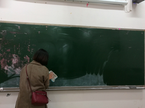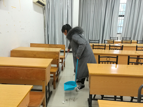 因为之前有相关的活动经验,团学会干事们在部长的指导下,有条不紊地进行工作。大家齐心协力全面打扫教室的各个角落,清理地面上的污渍,扫除教室桌内的纸屑杂物以及讲台上的粉尘,认真细致地擦洗黑板。到处都是专注劳动的身影,热火朝天的劳动景象。在大家的努力下,不到半个小时,部员们就完成了清扫工作。课桌摆放整齐,地板和黑板一尘不染,整个外语楼焕然一新。