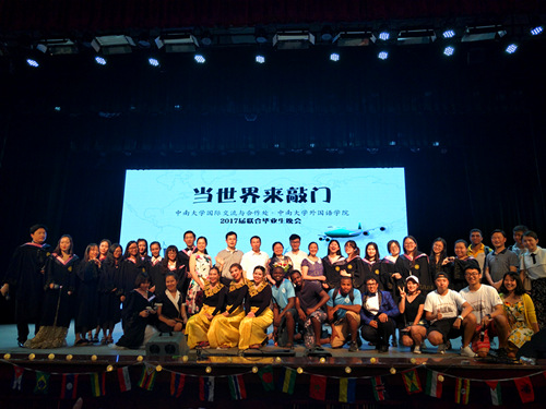 国际生乐队表演《那年的愿望》带我们回顾了大学四年一路走来的点点滴滴,传递着中外同学间浓浓的友谊;西语1301班的合唱诗朗诵寄托了西语班同学对毕业生们拥有一个灿烂未来的美好祝愿;国际教育学院同学准备的东南亚舞蹈尽显异域风情,赢得喝彩阵阵;法语1301班的情景剧《宠爱》青春洋溢,活力四射。