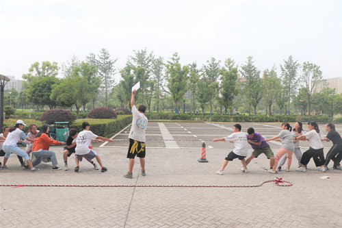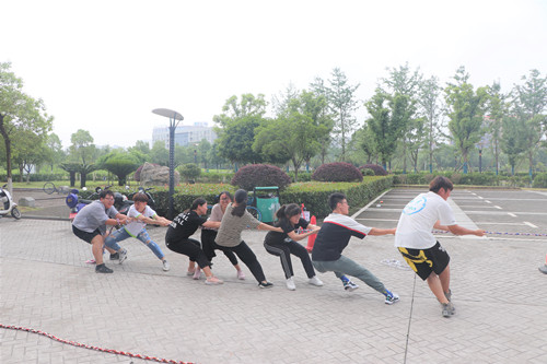 当裁判一声“开始”令下,绳的两端开始了力量的角逐。整齐划一、掷地有声的口号,统一向一个方向用力拉绳的动作,洋溢在每个同学脸上的坚毅的神情,从发丝中蜿蜒流下的如雨的汗水,无一不在向这场比赛的观众们展示参赛队伍们必胜的决心。伴随着在场观众此起彼伏的加油呐喊声,一场场激烈的晋级赛如火如荼地进行着,被裁判宣布晋级的队伍紧紧相拥在一起,为自己队友的默契而欢呼,无缘决赛的队伍虽感遗憾,却也从参与到这次拔河比赛的经历中更深刻地理解了集体团结的力量。