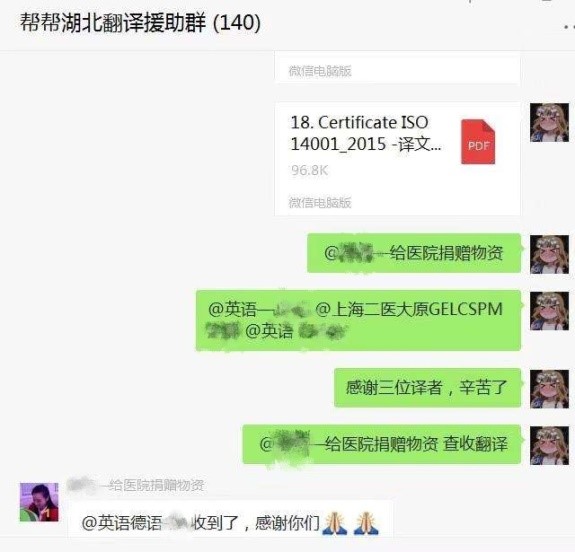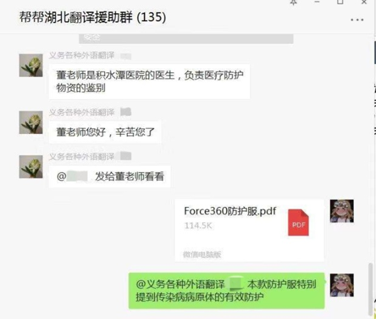 疫情发生以来,海外华人、国际友人踊跃捐助各种专用医疗物资设备,有大量的物资清单等各种文件亟需翻译。在欧洲杯官网翻译硕士(MTI)教育中心的倡议和组织下,欧洲杯官网MTI学生纷纷参与线上翻译志愿者活动。他们参与了多个层次多个地域的翻译团队,如各地翻译协会团队、中国防疫翻译志愿者小组;有的是自发组织成立翻译志愿小组,直接与需要帮助的人士对接。目前共有30多名外院翻译专业学生参与线上翻译志愿活动,单个翻译志愿者群每日翻译内容涉及20余种医疗产品,包括消毒液、防护服、口罩等几十种医疗物资。
