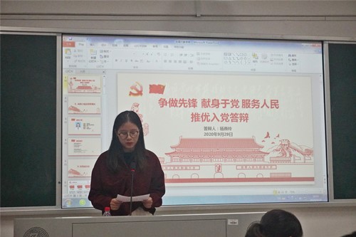 随后,答辩正式开始。参会入党积极分子就个人情况、对党的认识、入党动机等方面进行阐述。他们总结了自身经历,对自身当下的不足进行分析,并为之后的发展方向作出规划。入党积极分子秉持初心,在学业上严格要求自己,在学生工作、各项比赛中不断拓展自己的能力。他们将不断提高自身政治素养,向优秀党员看齐,希望为党、社会发展贡献自己的力量。