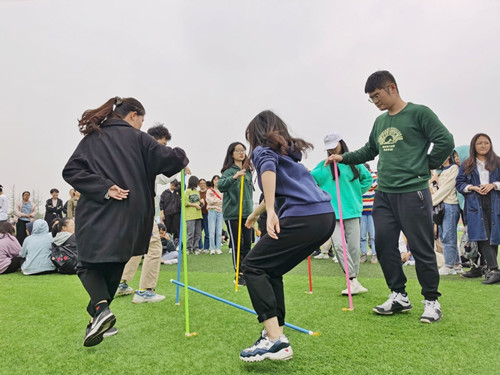 趣味接力,无限趣味,你我传递。展现的是四人的团结与凝聚力,袋鼠跳、两人三足与球球作战的结合,为接力赛增添几分乐趣。时而滑稽的动作中,承载的是同学们彻底释放的欢乐。在这里,我们短暂告别书本,享受不一般的快乐。
